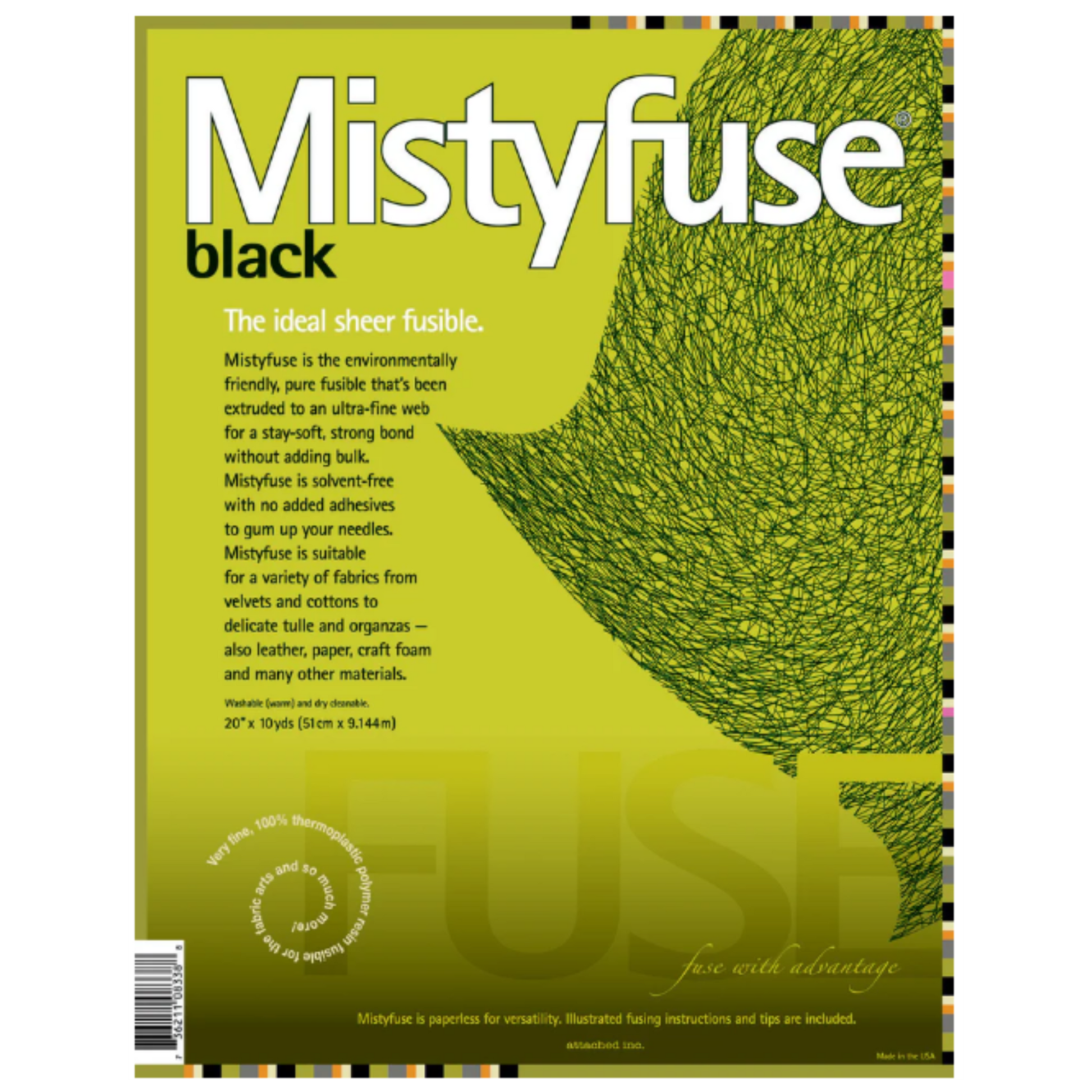 Sheer fusible that creates a lasting bond without bulk - won't gum up needles. Suitable for most fabrics, from velvets & cottons to delicate tulle misty fuse. Black 20in x 10yd