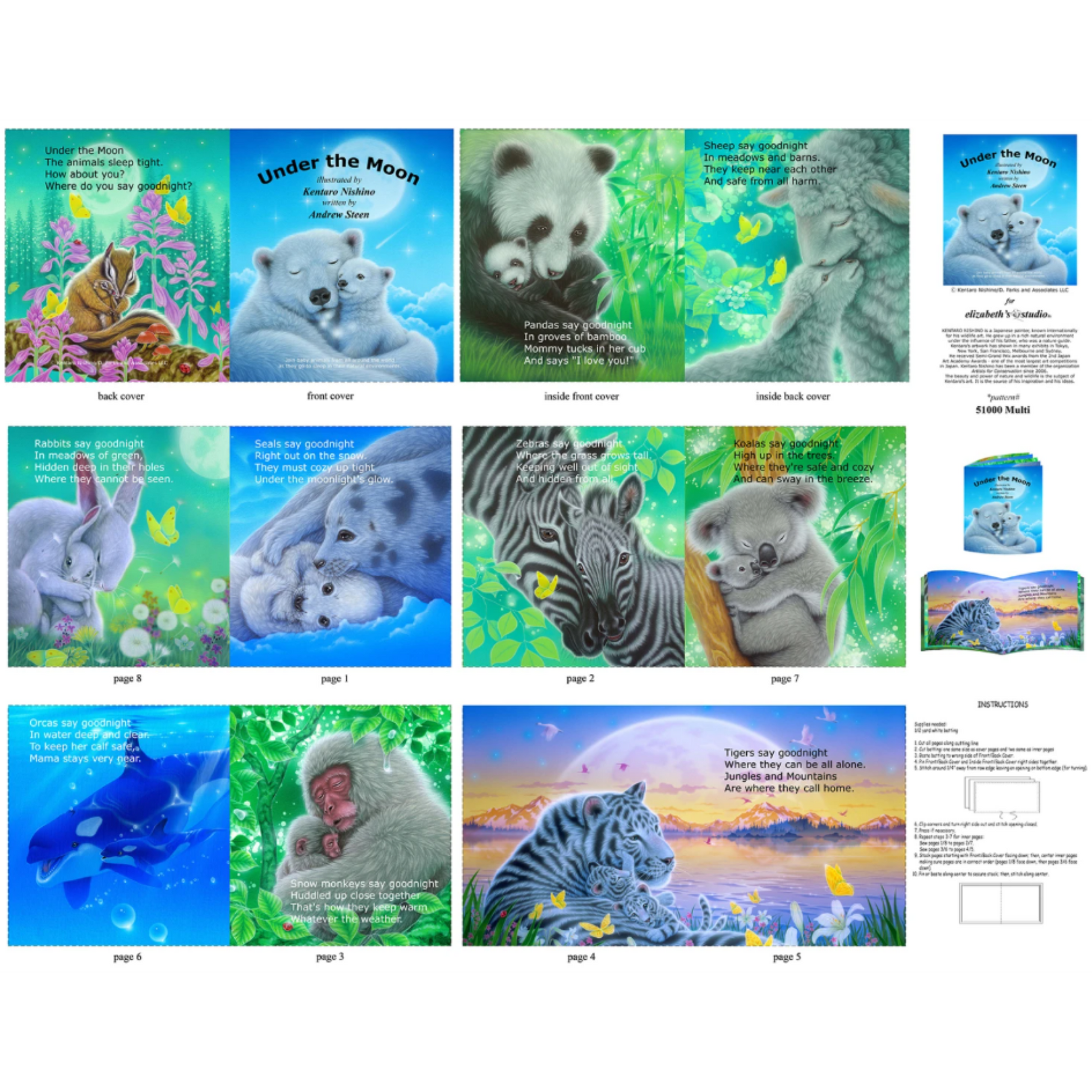 This enchanting fabric panel is designed to bring the magic of storytelling to life with its vibrant illustrations of various animals under the moon. Each section of the panel features a different scene, from a bear family under the moon to a zebra and her foal in a lush green setting, all rendered in a soft, whimsical style perfect for creating children's soft books or decorative quilts. The artwork is rich in detail, showcasing animals in tender moments, surrounded by nature, which makes it ideal for educational and comforting projects.